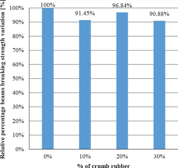 The addition of crumb rubber led to a slight decrease in the flexural breaking strength of the beams. The loss in strength was smaller compared to the reduction in tensile strength, suggesting that the addition of crumb rubber up to 30% of the volume can maintain sufficient structural integrity.