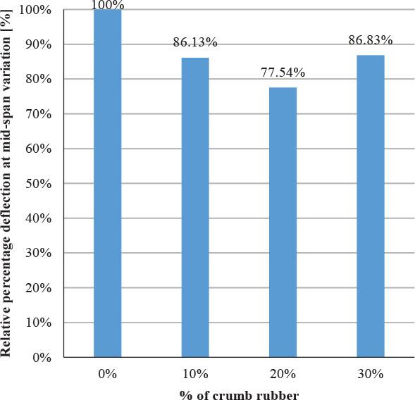 Deflection at mid-span decreases as crumb rubber content increases, which indicates that rubberized concrete beams are less prone to excessive deformation under load, potentially improving their overall serviceability.