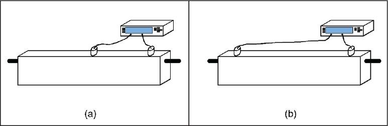 The UPV testing was conducted using a 54 kHz longitudinal wave transducer. The UPV measurements were performed by positioning the two transducers on opposite sides of the specimen (direct method), as shown in Figure 4; on adjacent sides (semi-direct method), as shown in Figure 5; and on the same side (indirect method) (Almasaeid et al., 2022), as shown in Figure 6.