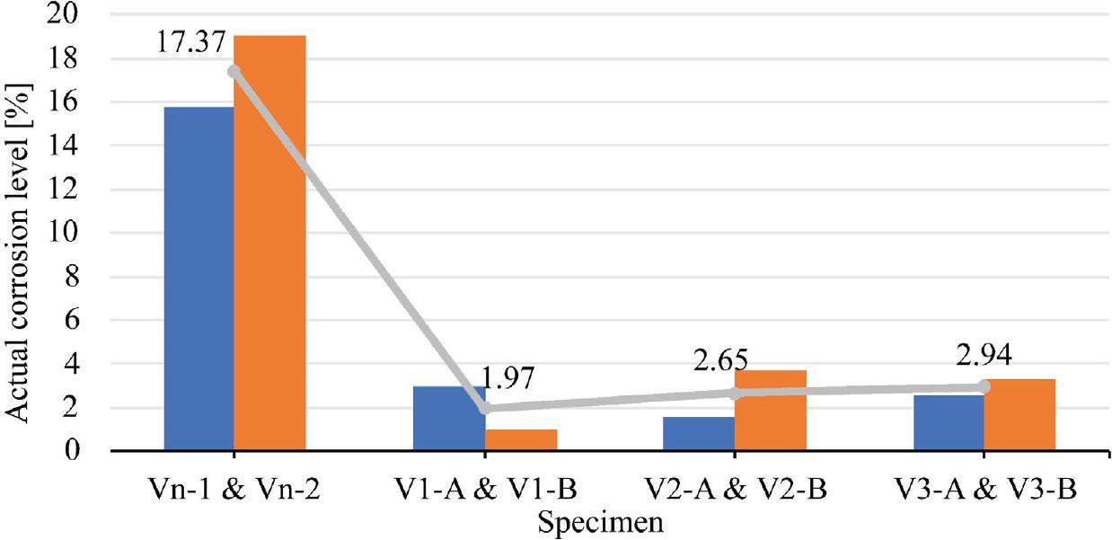 Results of corrosion acceleration over 72 h (Fig. 7) indicate a continuous increase in current until the final duration, with variations in the mix. In the control concrete, a decrease in current occurred after 55 h due to the reinforcement connected to the wire no longer being able to effectively conduct the current. Concrete with mixed variations exhibited both lower initial and average current compared to normal concrete. Concrete with the V1-B code, containing 15% of FA and 15% of SF, demonstrated the best corrosion resistance, with an average current of 0.075 A. Using Faraday’s law, the corrosion level and mass loss of the corroded reinforcement can be estimated, as shown in Table 3. Then, the corrosion level values were averaged, as shown in Figure 8.