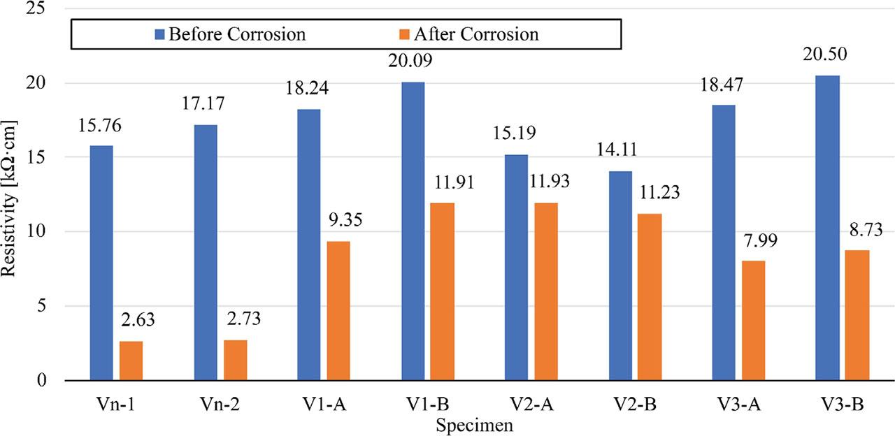 Figure 10 illustrates the results of ER testing before and after corrosion. The resistivity measurements prior to corrosion categorized the specimens with pozzolan-based admixtures as ranging from negligible to low levels of corrosion risk, with resistivity values between 14.11 kΩ·cm and 20.5 kΩ·cm. In contrast, the control concrete fell into the low-risk category with resistivity values below 20 kΩ·cm. After corrosion, the resistivity values decreased across all specimens. Concrete with pozzolan admixtures shifted to categories ranging from low to moderate, while normal concrete reached the high-risk category (Robles et al., 2022).