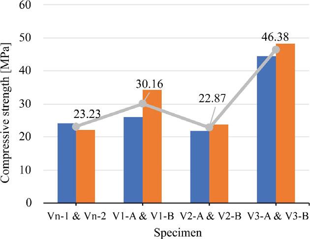 The specimens included one control mix (Vn) and three pozzolan concrete variations: V1 (15% FA + 15% SF), V2 (20% FA + 10% SF), and V3 (25% FA + 5% SF). In the pozzolan variations, 15% of the sand was replaced with BA, and SP was added at 2.5% of the cement weight. Additionally, Bacillus subtilis was incorporated directly into the mixture at 1% of the specimen’s volume. This mix design ensures consistency across specimens while evaluating the effects of pozzolan variations and bacterial addition on the performance of the concrete.