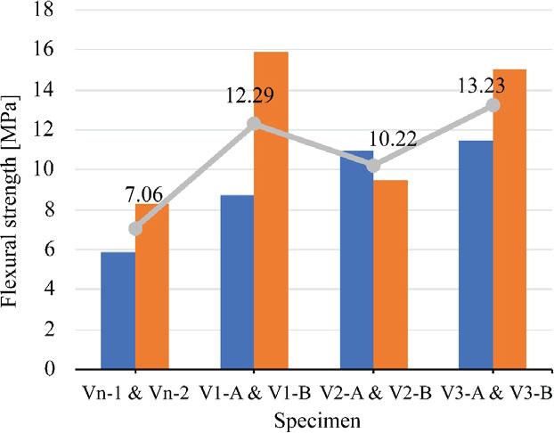 Compressive strength and flexural strength tests were conducted on specimens aged 28 days. Concrete with a mixture of 25% of FA and 5% of SF achieved the highest average compressive strength, as shown in Figure 13. Similarly, in the flexural strength tests conducted after corrosion acceleration, the same mixture (25% FA and 5% SF) exhibited the highest average flexural strength, as depicted in Figure 14.
