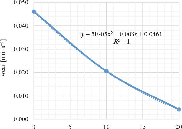 Figure 6 illustrates the correlation between age and wear. The observed pattern indicates that wear diminishes with an increase in the level of quartz powder. This indicates a particular effect that reduces the degradation of the paving block material. The graph has produced the equation y = 5E-05x2 − 0.003x + 0.0461, demonstrating a quadratic relationship. This suggests that the effect of quartz powder on wear is characterized by a curvilinear relationship rather than a linear one. With an increase in the level of quartz powder, the impact of reduced wear becomes increasingly pronounced. Furthermore, the equation’s ability to precisely depict the existing data is evidenced by an R2 value of 1. In summary, all the tested data points conform to the established pattern of the equation, without any exceptions. The findings indicate that increasing the percentage of quartz powder in the paving blocks could potentially reduce wear, highlighting a practical approach to enhancing durability. This graph illustrates a strong relationship between wear and quartz powder concentrations, indicating that paving blocks show diminished wear levels as quartz powder increases. This could serve as a basis for designing or optimizing the production of paving blocks to enhance durability and minimize erosion.