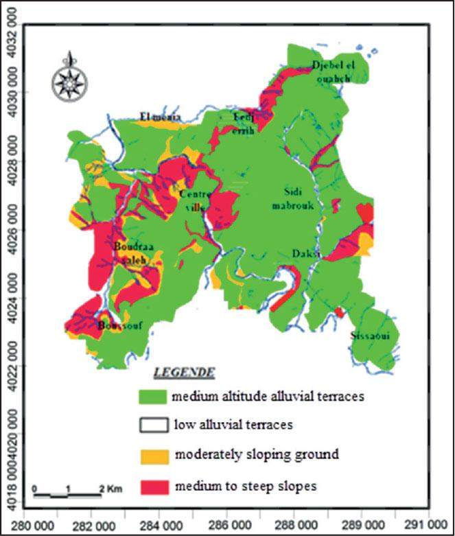 The lowest slopes (0‒10%), which account for a large part of the PDAU, are found on the alluvial terraces of the Rhumel and Boumerzoug wadis and, to the north-west, on the rocky outcrop, and the Mansourah, Coudiat, and Salah Bey plateaux.