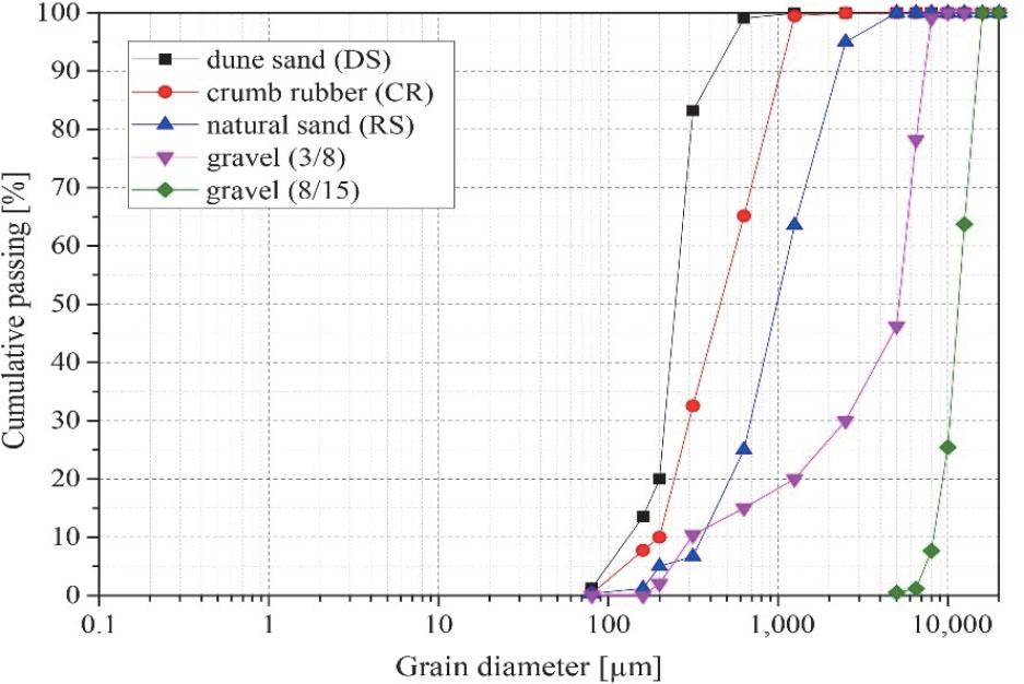 The crumb rubber size ranges from 0.08 mm to 1.25 mm. These residues exhibit a relative density of 1.22 and an estimated purity of approximately 45%. Figure 2 illustrates the particle size distribution curves of all the materials used: natural sand, dune sand, gravel, and rubber particles.