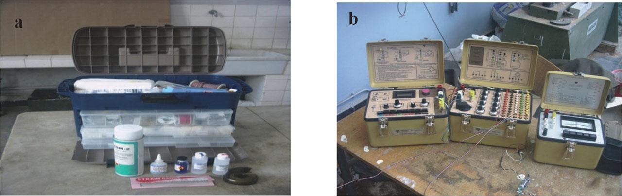 Apparatus used for modulus of elasticity testing: a – cleaning reagents, b – a strain-gauge bridge (extensometer)