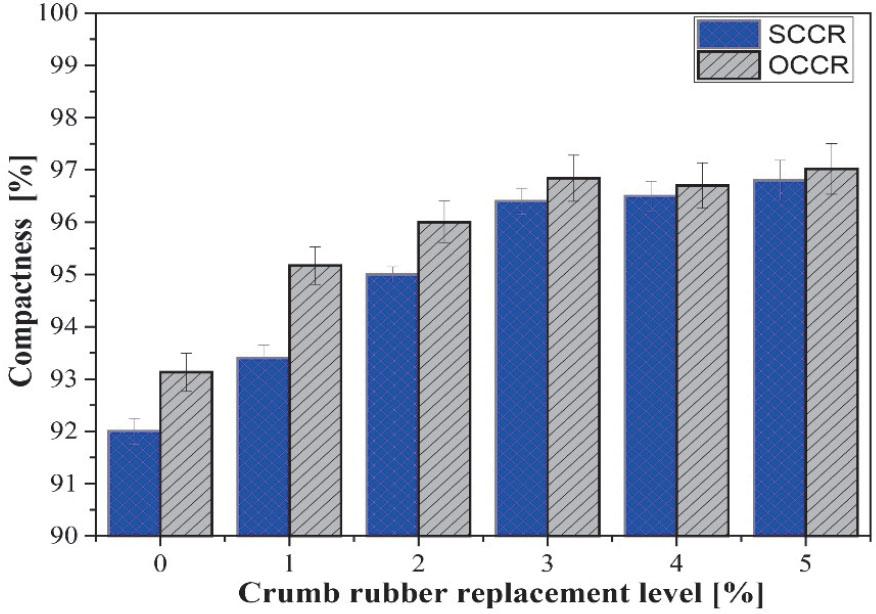 The results presented in Figure 5 show a steady increase in compactness with increasing CR content for both materials. For SCCR, compactness increases from 92.0% to 96.8% between CR = 0% and CR = 5%, corresponding to a relative gain of about 5.2%. Similarly, OCCR increases from 93.13% to 97.02%, i.e., a relative gain of about 4.2%, reflecting a gradual densification of granular packing as the CR content increases (Bulut et al., 2024).