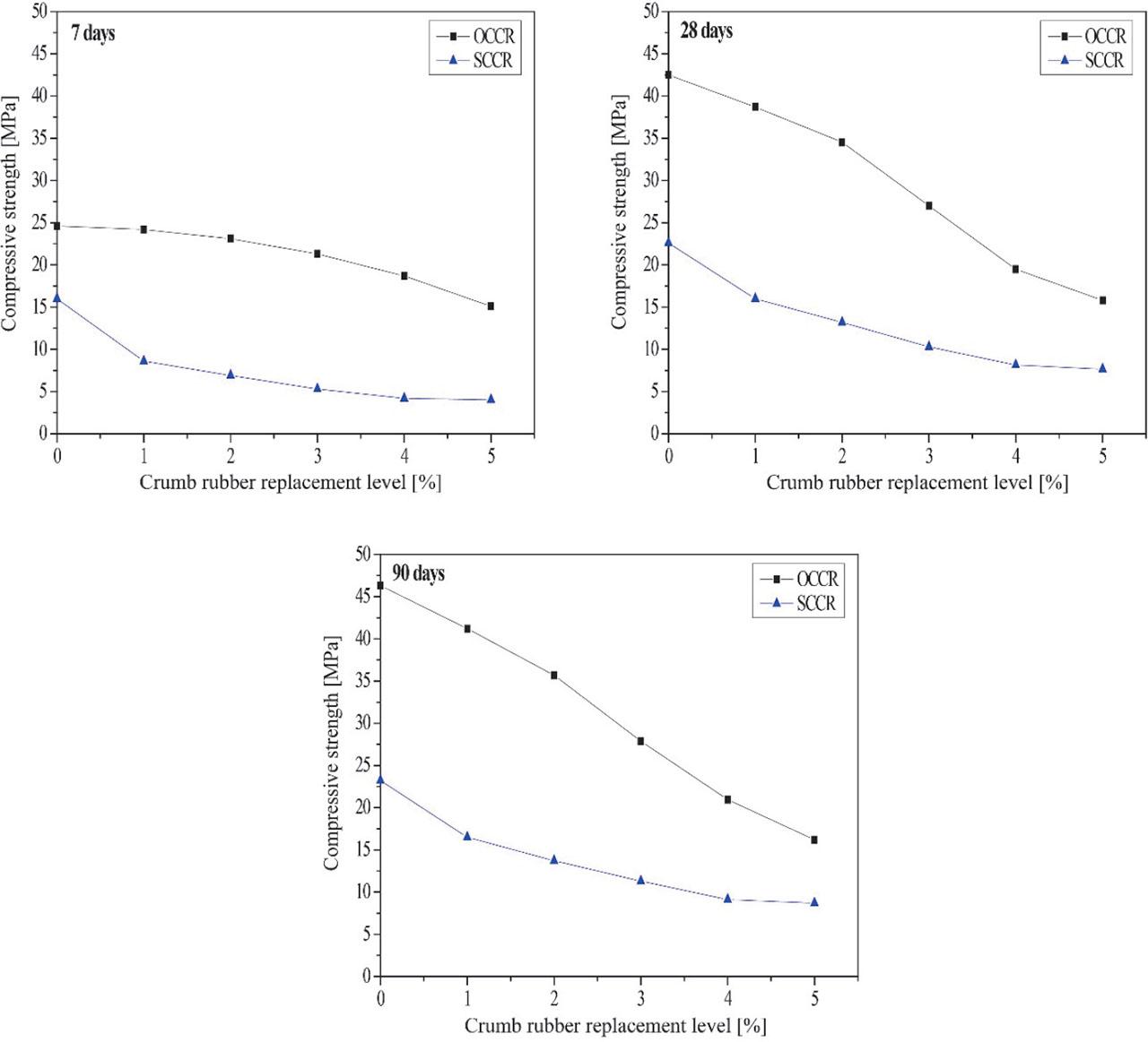 The incorporation of 5% crumb rubber resulted in marked compressive strength losses of about 63% for OCCR and 66% for SCCR, while OCCR retained a clear advantage over time despite partial convergence.
