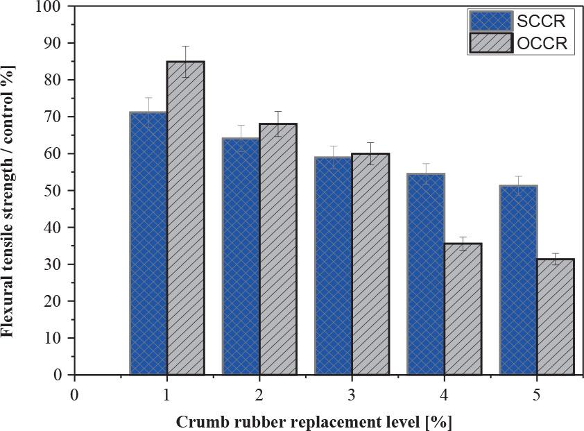 Flexural tensile strength ratio relative to the control versus crumb rubber content for dune sand concrete with crumb rubber (SCCR) and concrete with crumb rubber (OCCR)
