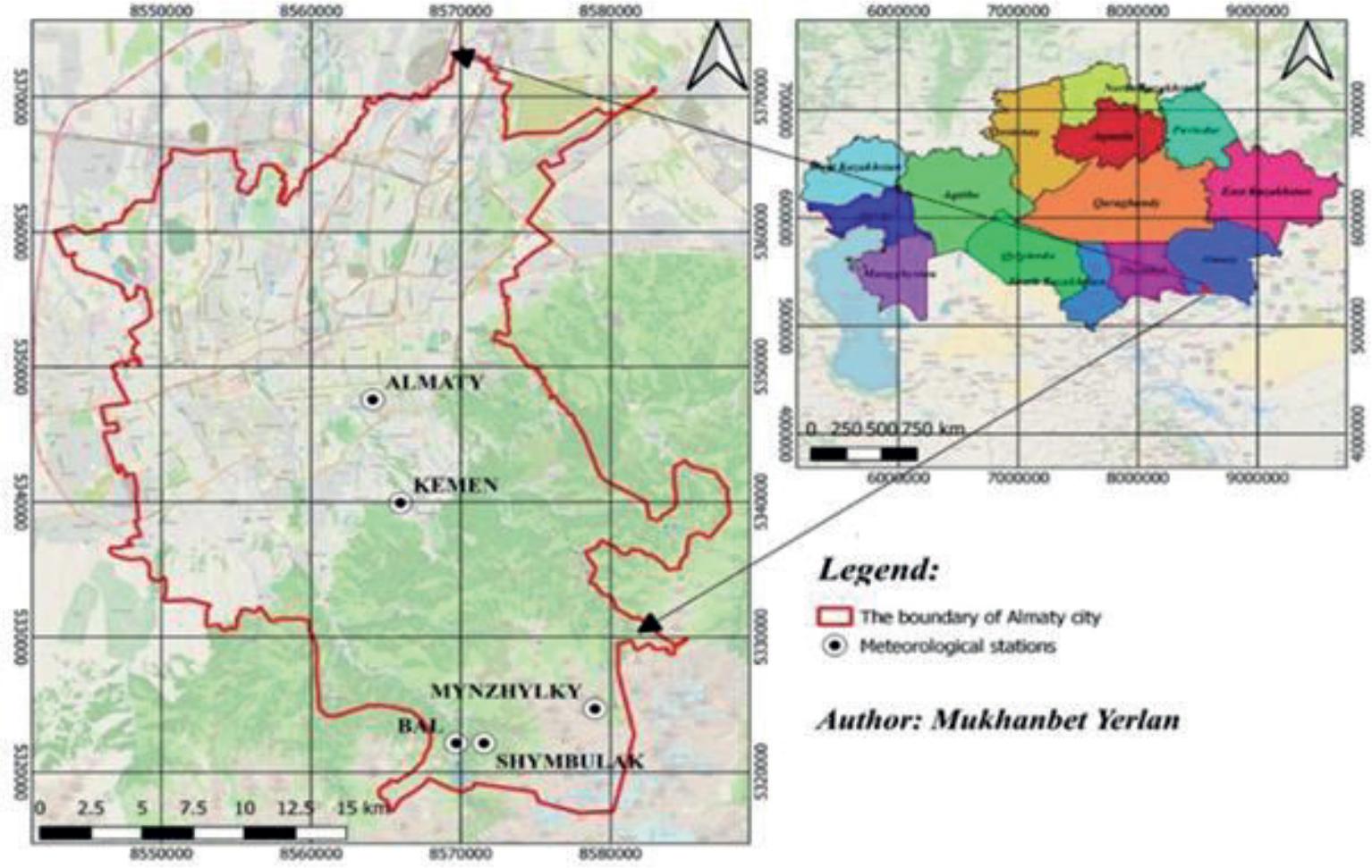 Location map of the meteorological stations in Almaty city, with a general map of Kazakhstan