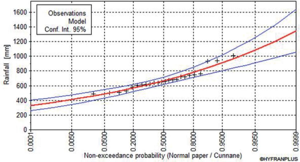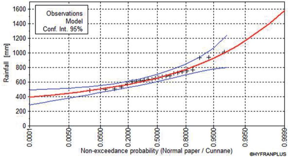 Figures 3 and 4 show the results of fitting the GEV and lognormal distributions to the observed values of annual precipitation maxima at the Almaty weather station. The red line shows the theoretical model, the black crosses show the empirical data, and the blue lines show the 95% confidence interval. These two graphs are provided as illustrative examples.