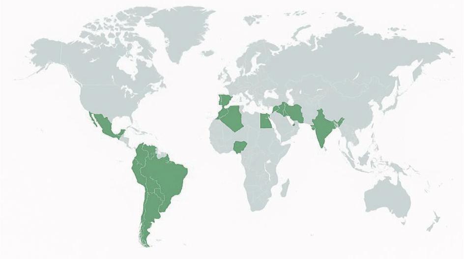Figure 1 shows a world map highlighting the regions or countries where the use of cactus mucilage in soil compaction has been applied or explored. The areas marked in green include parts of Latin America, North and East Africa, West Asia, and India, suggesting that this method is relevant mainly in arid or semi-arid regions where cactus species are common and accessible.