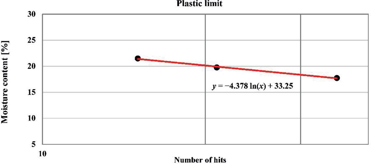 During the analysis of the samples from Tanks 1, 2, and 3, the liquid limit was determined (Fig. 2). For this purpose, samples with different moisture contents were prepared, and the number of blows required to close the cut groove was recorded. After performing the corresponding calculations, a liquid limit value of 19.16 was obtained for the sample.