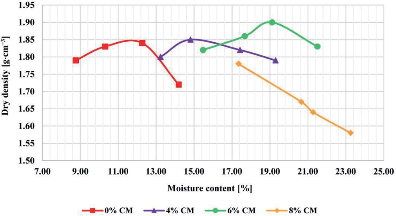 The mixtures were subjected to the standard Proctor test to determine optimum moisture content and maximum dry density (Flores et al., 2020; Guevara Lopez & Canaza-Rojas, 2023). With these data, compaction curves were generated – an essential tool in geotechnical engineering for understanding how soil density varies with moisture content and with the inclusion of additives. This analysis is fundamental for the design and construction of civil works, as it helps engineers to predict soil behavior under applied loads (American Association of State Highway and Transportation Officials [AASHTO], 2001).