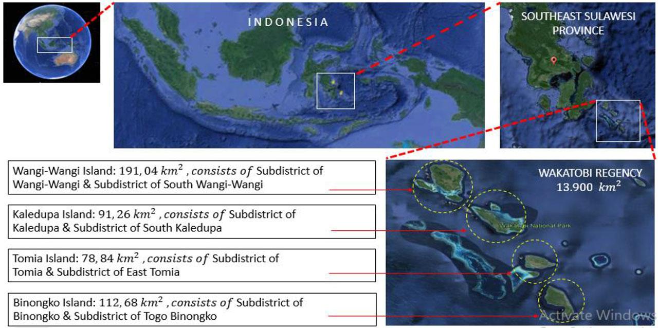 The location shown in Figure 1 is Wakatobi Regency, which is one of the districts in the province of Southeast Sulawesi, Indonesia. The capital of this district is located in the Wangi-Wangi sub-district, formed based on the Law of the Republic of Indonesia Number 29 of 2003, dated 18 December 2003 (Winfield, 2024). Previously, Wakatobi was part of the Buton Regency. The area of Wakatobi Regency is around 13,900 km2, consisting of a land area of ±473.62 km2 or only 3% and an area of water (sea) of ±13,426 km2 or amounting to 97% of the area of Wakatobi Regency (Hardi et al., 2024). It consists of four main islands that form the Wakatobi archipelago: Wangi-Wangi, Kaledupa, Tomia, and Binongko.