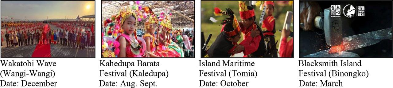 Several traditions and cultures have the potential to become tourist attractions (Rahmawati et al., 2023). Holding a cultural festival is one of the activities usually carried out by the local tourism department, which includes the Tindoi Fort Festival in the Wangi-Wangi District, Koba Fort Festival in the South Wangi-Wangi District, Barata Kaledupa Festival in the Kaledupa District, Pajujudi Festival in the Tomia District, and Blacksmith Festival in the Binongko District. This festival is regularly held every year, but in 2020, it was not held due to COVID-19. In 2021, several cultural festivals will begin to be held again on the Wakatobi; this can be seen at the WAVE festival in Wangi-Wangi Island and the Micro, Small, and Medium-sized Enterprises Festival in the Tomia Islands (Bauer, 2022). Here are some pictures of events/festivals on the Wakatobi tourism agenda in Figure 4.