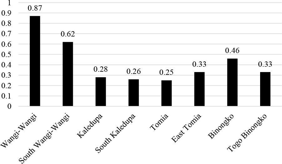 Likewise, the ancillary score in Table 7 shows Wangi-Wangi has the highest score, and Binongko has the lowest score. Ancillary services include communication channels, Internet services, ATM or bank branches, medical services, and postal services. These basic services are each present in the district area of each island. ATMs are found at local banks, not international ones. For Kaledupa and Tomia, only mini ATMs are used and are available in chosen small shops.
