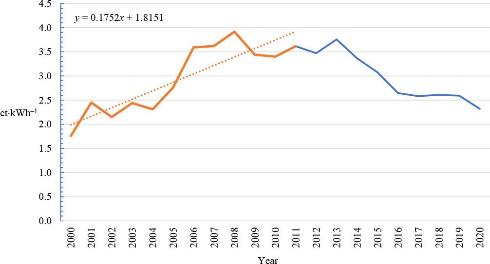 In this study, the following setup is chosen to predict future energy costs. The author’s possible knowledge of the historical data of energy costs forms its basis. Here, a graph was created of the annual costs from 2000 to the year the study was prepared. A trend line and extrapolation are generated for this graph. Figure 1 illustrates the trend line and the forecast for natural gas costs in Study 2: The study year is 2011, and historical data are available from 2000 to 2011. The forecast is assessed from 2012 to 2020.