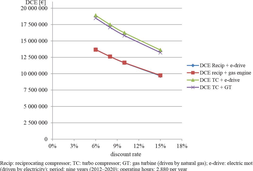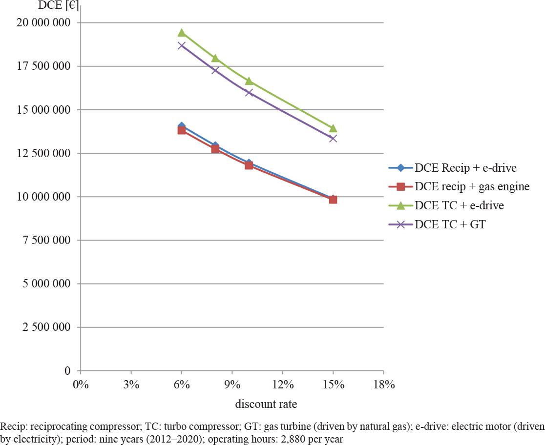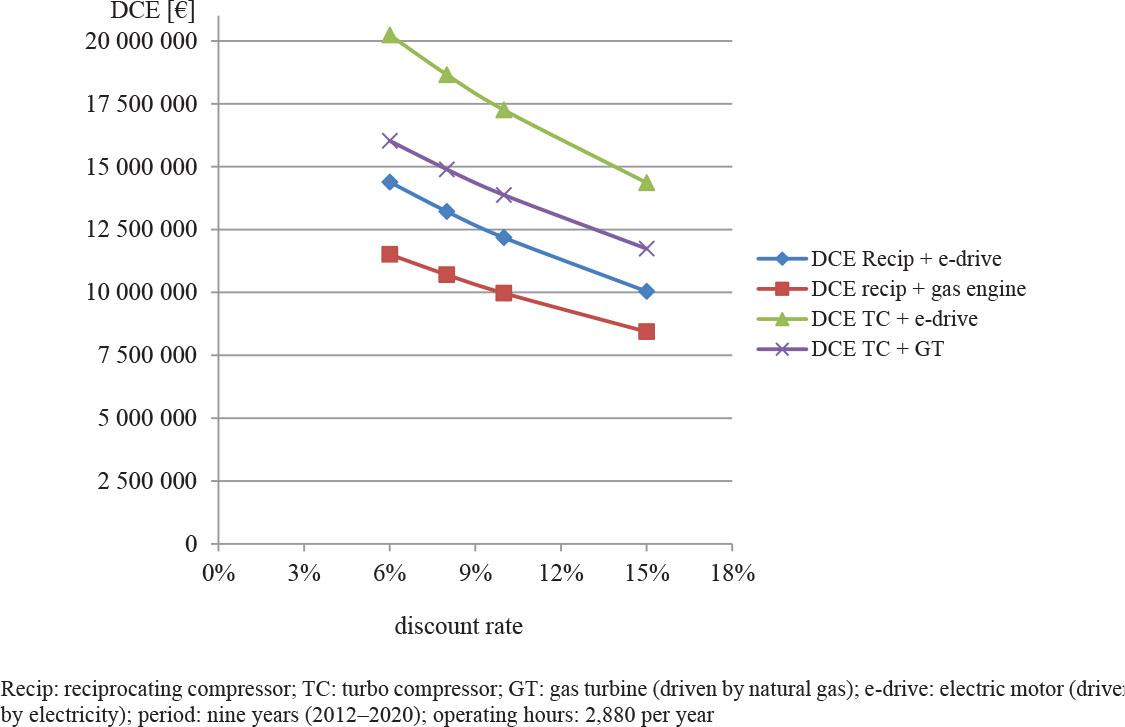 Transmission system operators (TSOs) and companies involved in transporting natural gas across Germany operate the high-pressure natural gas pipeline network. These compressor stations maintain pressure in the pipeline system. Before investing in compressor stations, TSOs contract consulting firms to conduct case studies on the intended investment. The most technically and economically advantageous option is developed using the NPV method (Homann et al., 2017). The case studies are prepared by experts. Consequently, the German natural gas industry makes decisions on structured models comprising economic and technical criteria and following LCC and NPV as the commonly used DCF methods. The case studies include capital expenditure (CAPEX) and operational costs for energy and maintenance in the OPEX. Two publications by Heyer and Wieke (1998) and Cierniak (2001) describe this approach in case studies. Essentially, both follow LCC analysis.