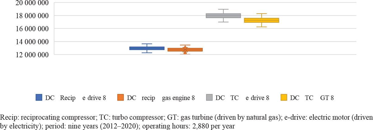 Decisions regarding investments in compressor stations in Germany’s natural gas infrastructure are based on LCC analysis, as described in EN ISO 15663, and this involves a comparison of different options, which must all meet investment requirements. Experts from consulting firms perform seven case studies, and TSO experts review them. These seven studies formed the basis for decision-making on investments in natural gas infrastructure. Moreover, these case studies represent expert opinions, from both the consulting firms and TSOs. The analysis of these seven executed case studies shows that the results of an LCC analysis depend on the input data and the estimate of future development.