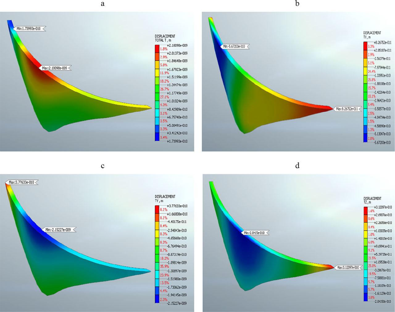 Displacements under static loads: a – total displacements, b – radial displacement, c – tangential displacement, d – vertical displacement