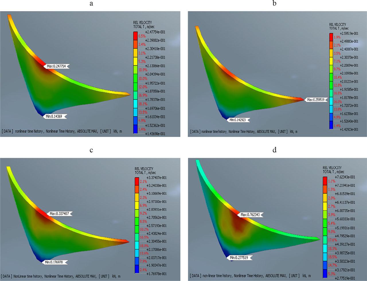 Relative velocity under dynamic loads: a – at the end of the first earthquake, b – at the end of the second earthquake, c – at the end of the third earthquake, d – at the end of the fourth earthquake