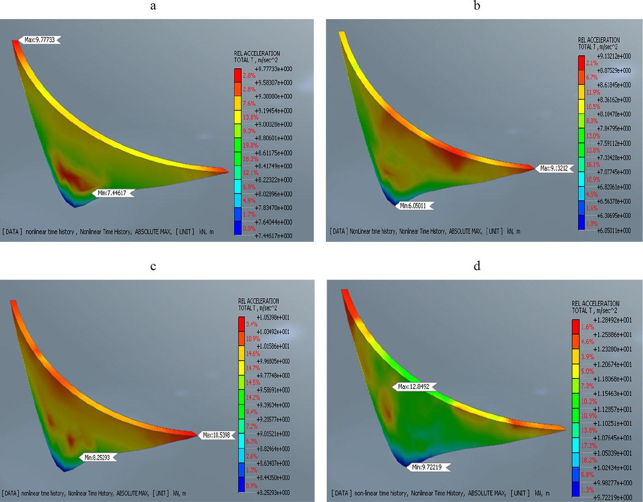 Figure 13 shows the relative acceleration distribution of the investigated arch of the Tichy-Haf Dam during an earthquake. The maximum relative acceleration is 9.77 m·s−2, located at the crest of the arch dam (Fig. 13a). This high acceleration indicates that the crest experiences the most significant dynamic response to seismic activity. Being the furthest point from the foundation, the crest is subjected to greater forces and movements during seismic events, leading to higher acceleration values. The minimum relative acceleration is 7.44 m·s−2, found near the base of the dam (Fig. 13a). This lower acceleration can be attributed to the constraints imposed by the foundation, which limit movement and therefore result in lower acceleration. The gradient of relative acceleration from the base to the crest indicates a significant variation in the dynamic response along the height of the dam. The observed acceleration peaks (Figs 13b, 13c, 13d) for the second, third, and fourth earthquakes are 9.13 m·s−2, 10.53 m·s−2, and 12.84 m·s−2, respectively. In contrast, the minimum acceleration for this earthquake is 6.05 m·s−2, 8.25 m·s−2, and 9.72 m·s−2, respectively.