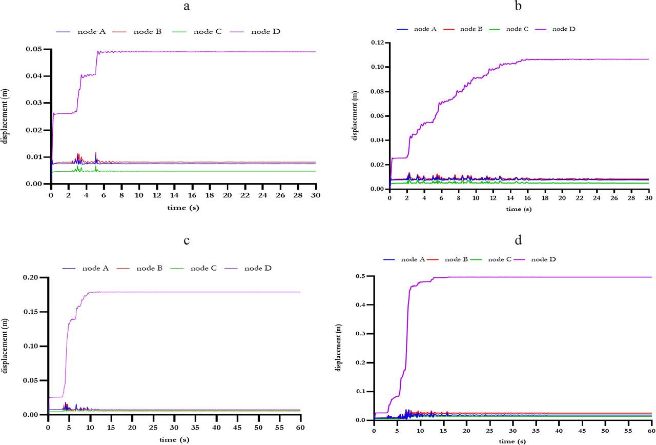 Figure 15 depicts the displacement curves observed during the four earthquakes. The loads applied to the arch dam in its initial state consist of dead weight and water thrust. These loads, at this juncture, have caused minimal impact on the dam, resulting in only a slight displacement. The discrepancy in displacement among various nodes underscores the non-uniform distribution of dynamic loads within the structure. Nodes A and B experience moderate displacements, while Node D undergoes the most significant deformation, and Node C remains relatively unaffected. The maximum displacements recorded during Earthquakes 1, 2, 3, and 4 were 0.048 m at 5 s, 0.106 m at 16 s, 0.18 m at 10 s, and 0.499 m at 15 s, respectively, with no further evolution until the conclusion of each earthquake.