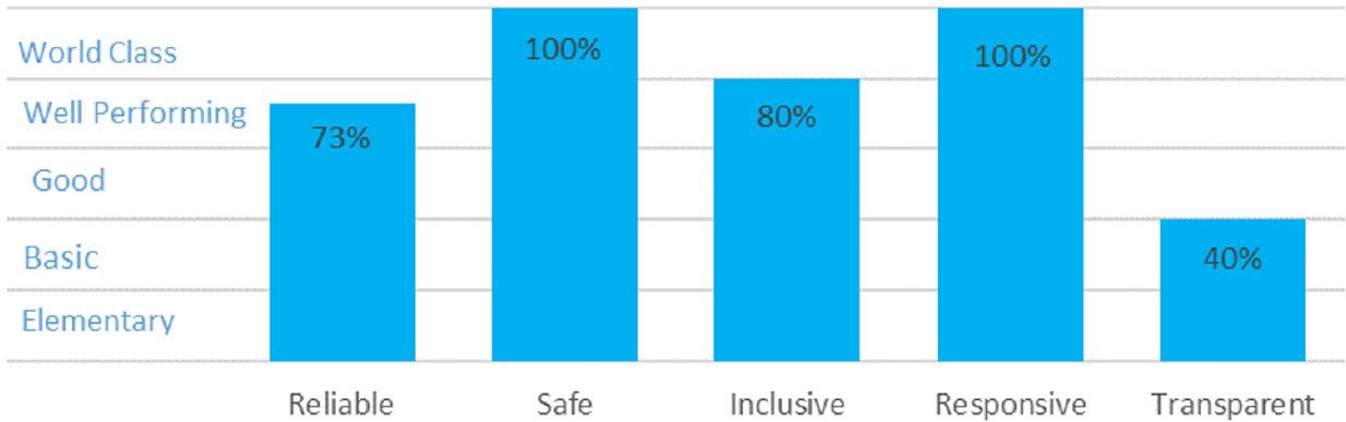 Nonetheless, the utility’s performance in the transparency category, achieving a basic level (40%), suggests significant potential for improvement. Transparency is an essential factor in establishing confidence among stakeholders, such as customers, regulatory agencies, and financial investors. The low score indicates that, although the utility may be functioning effectively in its operations, it likely falls short in transparent and precise financial reporting, disseminating operational data, and performance measures. The lack of transparency may stem from difficulties in data administration, an absence of established reporting standards, or inadequate communication regarding the utility’s financial status and operational performance to the public. Furthermore, openness in utility administration is vital for promoting accountability and guaranteeing the effective allocation of resources, particularly in publicly owned utilities.