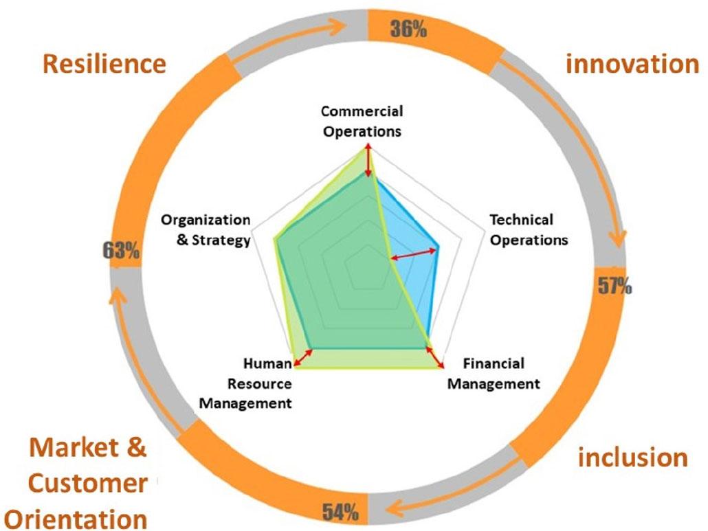 Figure 3d shows the financial management element, where gaps appear in three areas. The first area is financial model and forecasting, which in its current state reveals a full-cost recovery tariff analysis (OPEX, depreciation, and return) with disaggregation by customer category, irregularly done per year. Tariff design is profoundly affected by social and environmental issues, requiring a theoretical framework that can incorporate these complexities (Granda-Aguilar et al., 2024). The desired level is a multi-year cost recovery tariff analysis, which is updated annually. The second area is accounting and financial reporting, with the current state of the detailed fixed asset register (including cost, location), and defined assets. The desired level is an asset management system that incorporates the condition, maintenance planning, and management of the assets. The third area is control and transparency, where the accounts are not published in their current state. The desired level is in the world-class category, where the accounts are published regularly. The domains of accounting and financial reporting, along with control and transparency, are essential to the utility’s evolution into an excellent company. The former emphasizes operational efficiency and asset optimization, whereas the latter fosters trust and accountability. Overall, they constitute interconnected pillars of financial resilience and governance, ensuring that the utility is both efficient in service delivery and transparent and responsible in its operations. These adjustments, though challenging, are essential for the utility’s aim of sustainability and excellence.