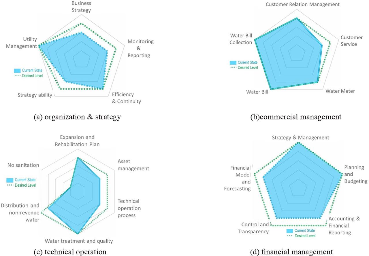 The green management element has a gap in the greenhouse gas (GHG) emissions area (Fig. 4b). In the current state, GHG emissions have not been considered, so at the desired level, GHG measurements have been included in the water utility’s objectives but have not been completed.