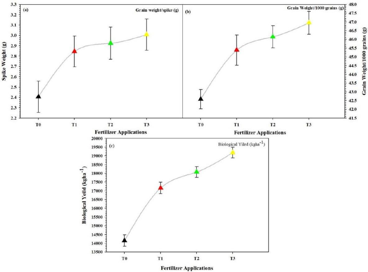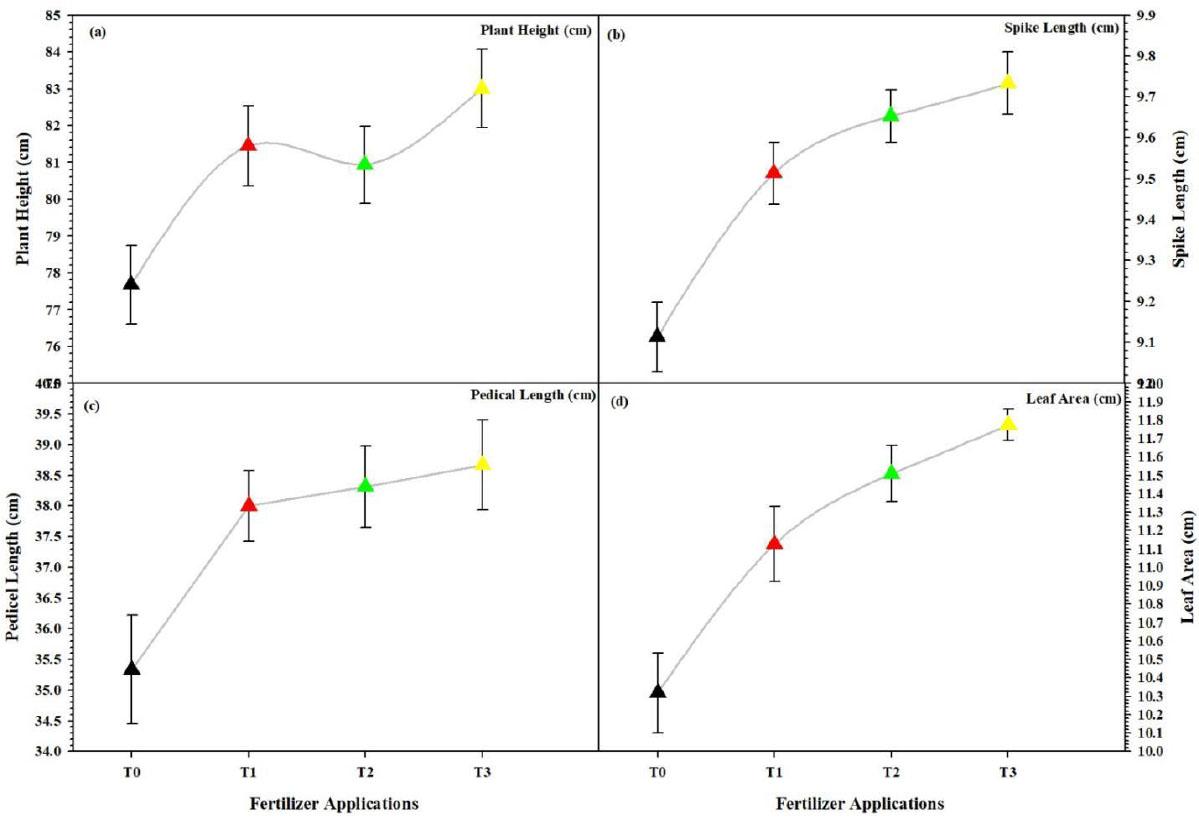 The treatments T2 and T3 (1.65 ±0.071, 1.64 ±0.053, 0.517 ±0.014, 0.548 ±0.016, 2.68 ±0.021, 2.72 ±0.015, 1.13 ±0.08, and 1.14 ±0.01) were non-significant (p < 0.05) under different applications of both fertilizers; whereas T0 and T3 (1.173 ±0.0442, 1.642 ±0.0534, 0.332 ±0.0029, 0.548 ±0.0164, 2.32 ±0.041, 2.72 ±0.015, 1.12 ±0.05 and 1.14 ±0.01) were significant (p < 0.05) under different applications of both fertilizers. Overall the results were significant (p < 0.05) under different applications of both fertilizers.
