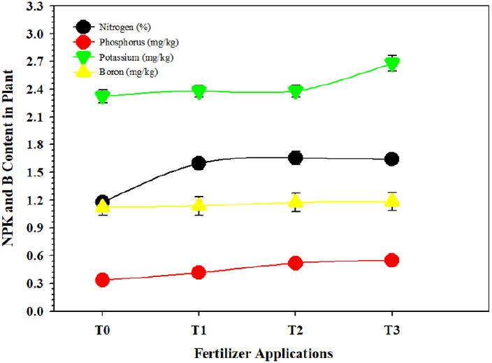 Figure 5 presents the analysis results of nitrogen [%], available phosphorous [mg·kg−1], available potassium [mg·kg−1], and extractable boron [mg·kg−1]. The results showed that the mean maximum of NPK content and extractable boron content were recorded for T3 (1.642 ±0.0534, 0.5483 ±0.0164, 2.72 ±0.015 and 1.14 ±0.01) compared to other treatments, T0, T1, and T2 respectively (Fig. 5), where the maximum application (210 kg·ha−1 and 1.8 kg·ha−1) of potassium and boron fertilizers were applied (Fig. 5), with the mean minimum being recorded for control T0 (1.173 ±0.044, 0.332 ±0.0029, 2.32 ±0.041 and 1.12 ±0.05).