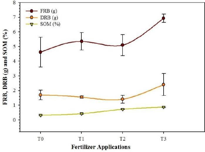 The analysis results of the fresh and dry root biomass and soil organic matter results (Fig. 6) indicated that the mean maximum and significant (p < 0.05) results were recorded for both fresh and dry root biomass T3 (6.932 g ±0.283) compared to all other treatments, T0, T1, T2 and T3 (4.616 g ±1.018, 5.357 g ±0.593, 5.0987 g ±0.7219 and 6.932 g ±0.283), whereas a minimum was recorded for the control, T0 (4.616 g ±1.018).