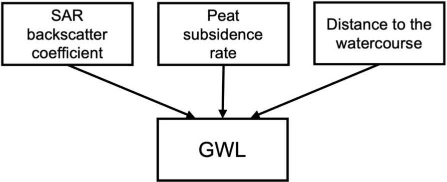 Various remote sensing data types and sources are widely used in peatland monitoring (Harris & Bryant, 2009; Lees et al., 2018; Millard et al., 2018; Food and Agriculture Organization of the United Nations [FAO], 2021; Habib & Connolly, 2023; Ghezelayagh et al., 2024). However, no universally applicable and accurate tool or methodology has been implemented to assess GWL in peatlands globally. The choice of remote sensing datasets depends on the specific parameters that need to be monitored, as some can also be used for vegetation or soil moisture monitoring. Several options are available for soil moisture, which is strongly connected to GWL (Irfan et al., 2020). It is important to note that regional-scale peatland monitoring requires data with high spatial resolution. Therefore, datasets such as NASA’s soil moisture active passive (SMAP) instrument, with a spatial resolution of 36 km, are unsuitable. Synthetic aperture radar (SAR) has proven to be a valuable tool in land monitoring, particularly in forestry and agriculture. Dual-polarized radar backscatter, which is sensitive to soil moisture content, can thus help predict the GWL in peatlands (Kim et al., 2017; Lees et al., 2021). Consequently, this data can be effectively integrated as input into predictive models, such as Bayesian belief networks.
