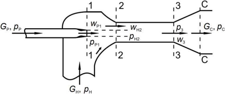 Figure 2 shows the design scheme of an ejector with a cylindrical mixing chamber. The figure shows the parameters of the working, ejected and mixed flow, as well as the main sections for which the equations are drawn up.