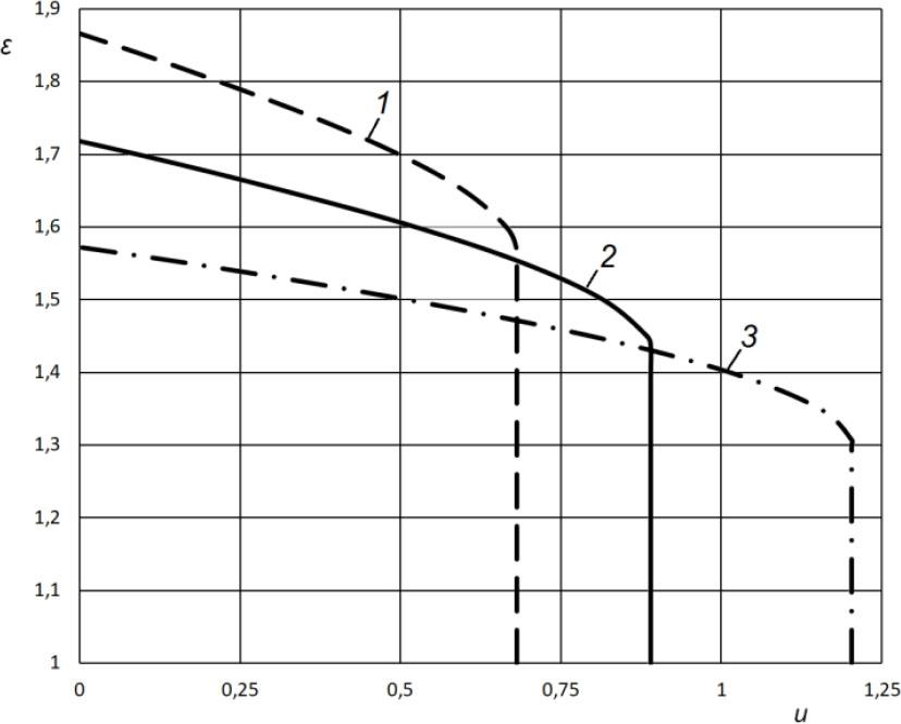 The subroutine for determining the root of a nonlinear algebraic equation automatically changes the value of λc3 in a given range until this inviscidity becomes zero with a given permissible error. Thus, at a given pressure pc the value of λc3 is determined such that the law of mass conservation (5) and the law of momentum conservation (11) are fulfilled. After specifying λc3, the ejection coefficient u can be determined. Figure 4 shows the dependence of the flow compression ratio ε as a function of the ejection coefficient u at three values of the ejector module.
