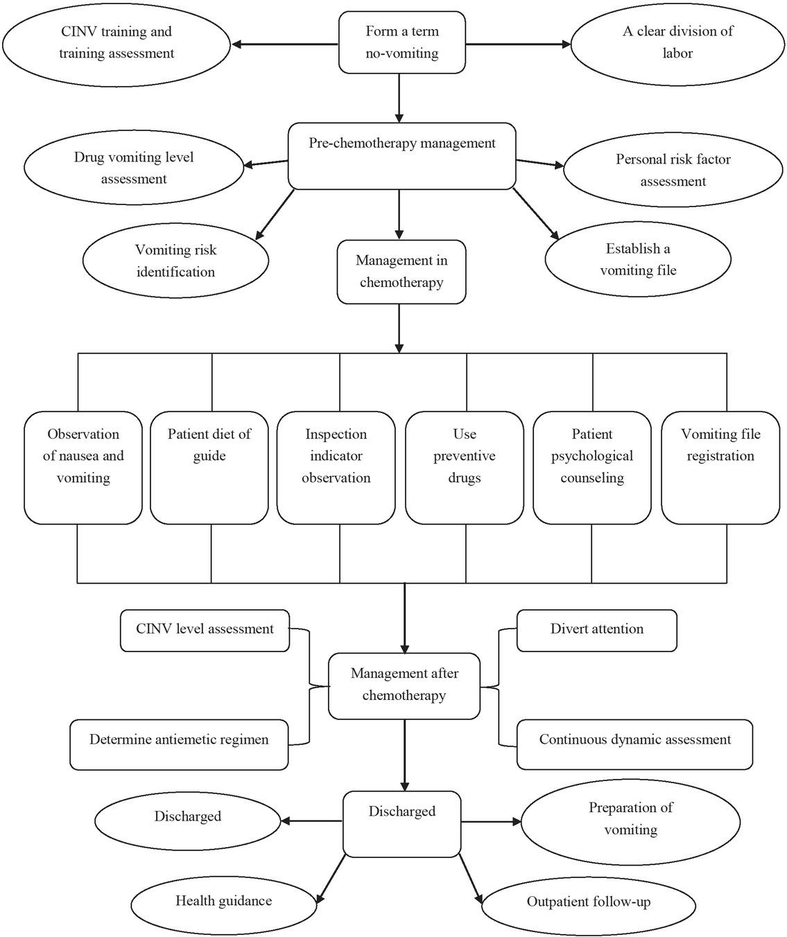 After the establishment of a no-vomiting team, all the members got the specified assignment. The observation group was given the standardized management of CINV when they were in the hospital, including the management before, during, and after the chemotherapy. The specific process is shown in Figure 1.