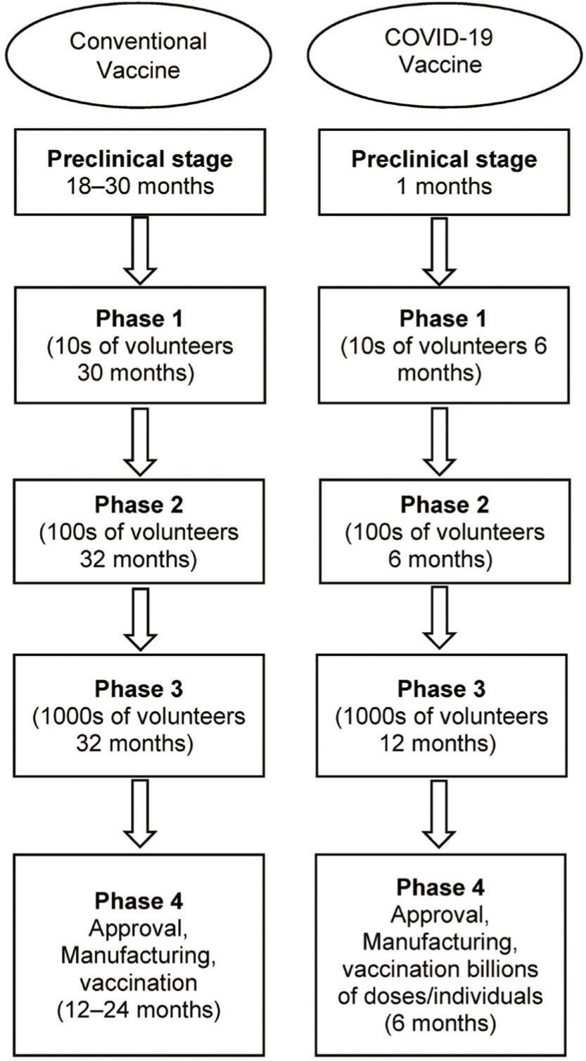 Different stages of clinical trials for conventional vaccines by comparison with COVID-19 vaccines.