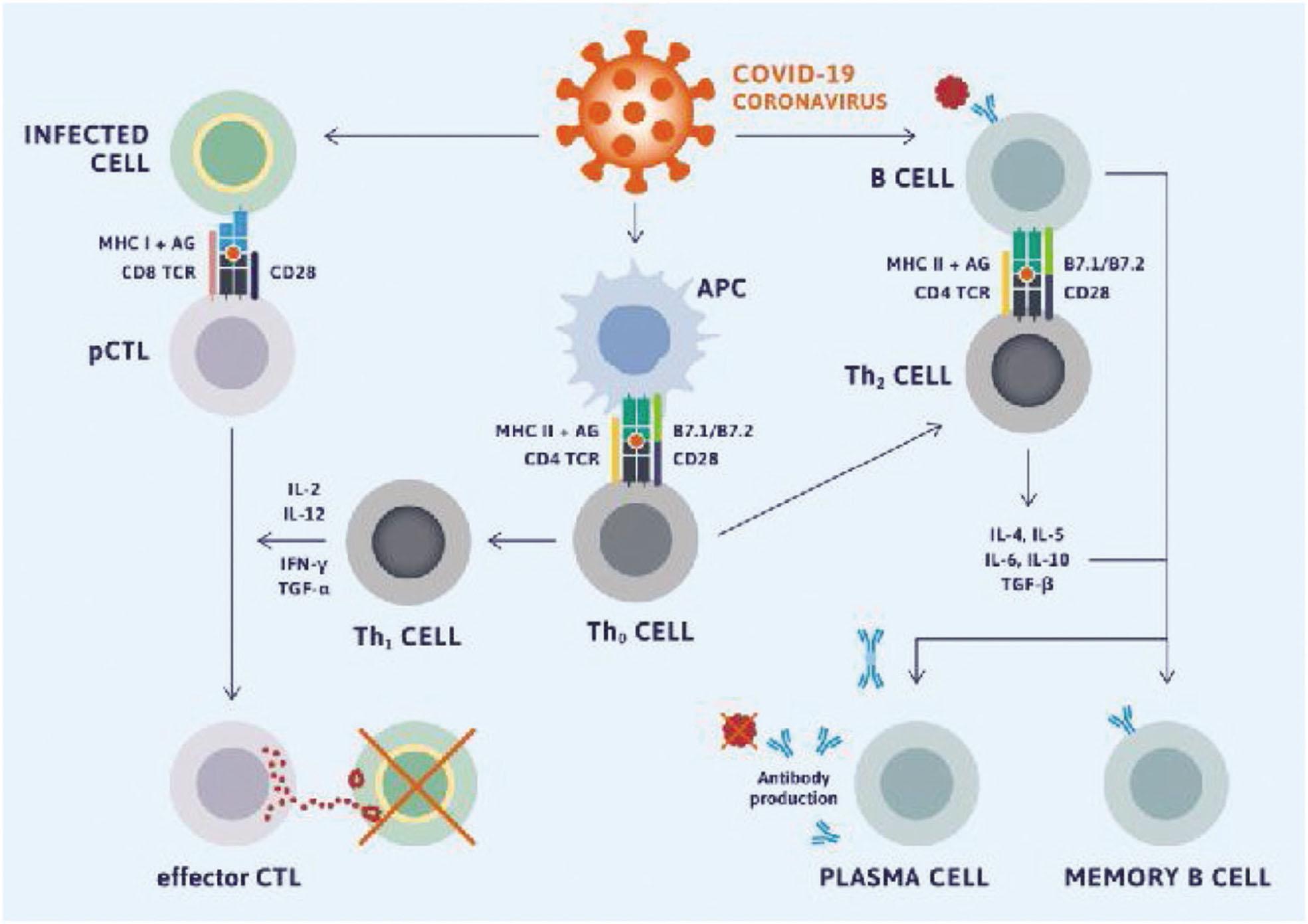 Adaptive immune response produced by SARS-CoV-2 (reproduced from Ref. [13] with permission). AG, antigen; APC, antigen-presenting cell; CTL, cytotoxic T-lymphocyte; IFN, interferon; IL, interleukin; MHC, major histocompatibility complex; TCR, T-cell receptor; TGF, transforming growth factor.