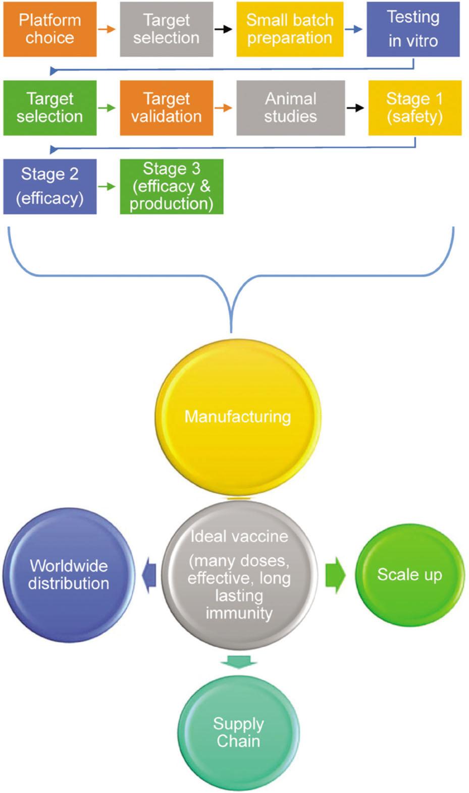COVID-19 has affected the health system worldwide and urges the need for an effective and safe vaccine. Researchers, developers, and manufacturers are racing to develop these vaccines rapidly resulting in many vaccine candidates, with a few entering Phases 1 and 2, and Phase 3 clinical trials within a relatively short period of 6 months, followed by Phase 4, which includes regulatory approval and licensure. In doing so, most of the advanced vaccine platforms that have been extensively explored for other infections and cancer are being used [45, 86, 87, 122]. The traditional vaccine development timeframe is compressed to 1–2 years, with overlapping preclinical, clinical, and scale-up manufacturing processes occurring in parallel. This rush would result in difficulty in having accurate information about the longevity and quality of vaccine-induced protective immunity. Moreover, it is not easy to compare the effectiveness of various candidates because each vaccine has been studied in isolation. Prioritization is another important issue requiring close attention as vaccines become available. Implementation of clear vaccination programs, which take into account all the vulnerable groups that could be affected and affect others is necessary, especially because there are challenges that remain for resources, manufacturing, and distribution [123].