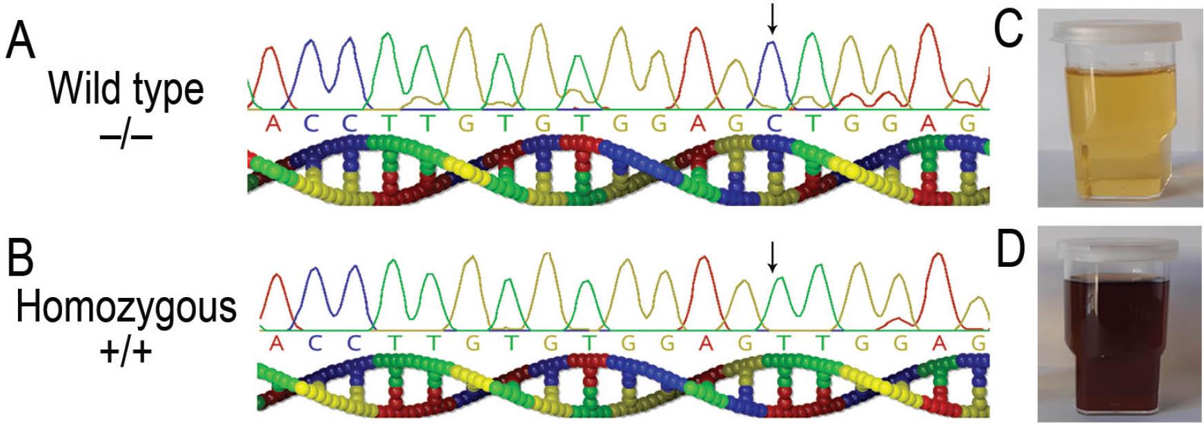 Sanger sequencing analysis of DNA from the patient with the case of alkaptonuria reported here. (A) Electropherogram of exon a6 HGD from a control (wild type) showing C at position 365. (B) Electropherogram of exon a6 HGD from the patient with alkaptonuria demonstrated a point mutation leading to replacement of C with T at position 365 (c.365C>T, p.Ala122Val). The black arrow refers to the position of the missense mutation. (C) Urine sample of control (wild type) did not show any change in color after 24 h. (D) Urine sample from the patient with alkaptonuria in which the color changed from yellow to dark brown or black upon standing for 24 h due to oxidation of HGA to benzoquinone acetic acid. HGD, homogentisate 1,2-dioxygenase; HGA, homogentisic acid.