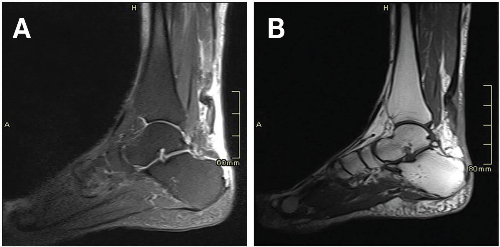 Sagittal fat saturated proton density-weighted (A) and sagittal T1-weighted (B) magnetic resonance images showing an insertional type of Achilles tendon rupture. There is discontinuity and retraction of the Achilles tendon. The tendinous insertion into the calcaneus tuberosity is completely disrupted.