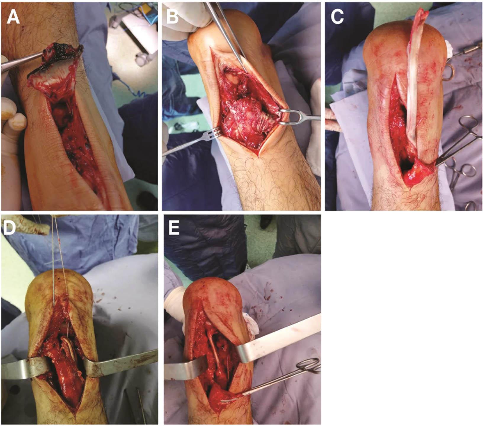 Surgical exploration showing: (A) complete left Achilles tendon rupture at its calcaneal attachment with dark-black pigmentation of the frayed ends, (B) the gap created after removal of the pigmented tissue, (C) the FHL tendon graft, (D) the FHL tendon graft after insertion in the calcaneal tuberosity, and (E) suturing of the proximal stump of the Achilles with the FHL tendon graft using a suture anchor. With documented consent for publication from the patient. FHL, flexor hallucis longus.