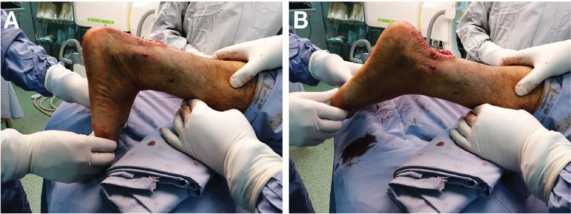 Intraoperative test showing (A) dorsiflexion and (B) plantarflexion of the ankle after repair. With documented consent for publication from the patient.