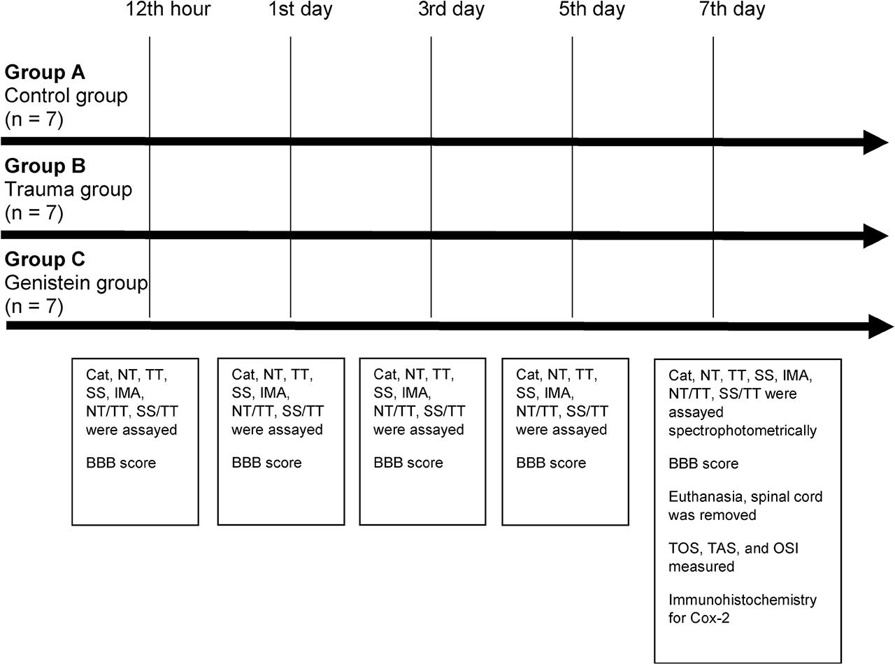 Timeline for the experiment. In group A (n = 7, control group, only T7-8-9 laminectomy), in group B (n = 7, trauma group, after T7-8-9 laminectomy and trauma was induced with a modified Allen weight-drop method, in group C (n = 7, genistein group, T7-8-9 laminectomy and spinal trauma was induced as described above. It was planned that group C would receive the first dose of genistein at 15 min immediately after trauma and would be given genistein subcutaneously at 2 mg/kg/day for 7 days). The rats were killed on the 7th day and the spinal cord was removed as a whole. No rats were lost, and no infection, or additional problems were observed during the experiment. cat, catalase; Cox-2, cyclooxygenase-2; IMA, ischemia-modified albumin; NT, native thiol; OSI, oxidative stress index; SS, disulfide; TT, total thiol; TAS, total antioxidant status; TOS, total oxidative status.