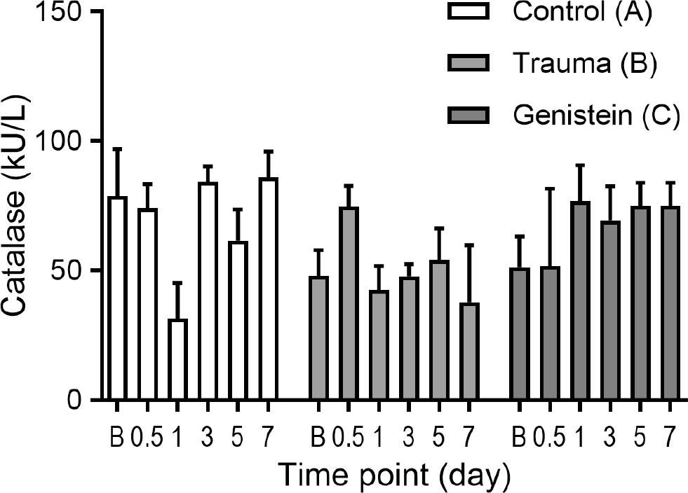 Catalase serum levels. Significant difference was observed on the 7th day (P = 0.001). Compared with the baseline, serum catalase values increased slightly in the control group (A white bars), decreased in the trauma group (B light gray bars), and increased significantly in the genistein group (C dark gray bars) on the 7th day. B, baseline; 0.5, 12th hour. Bars indicate means. Error bars (SD).