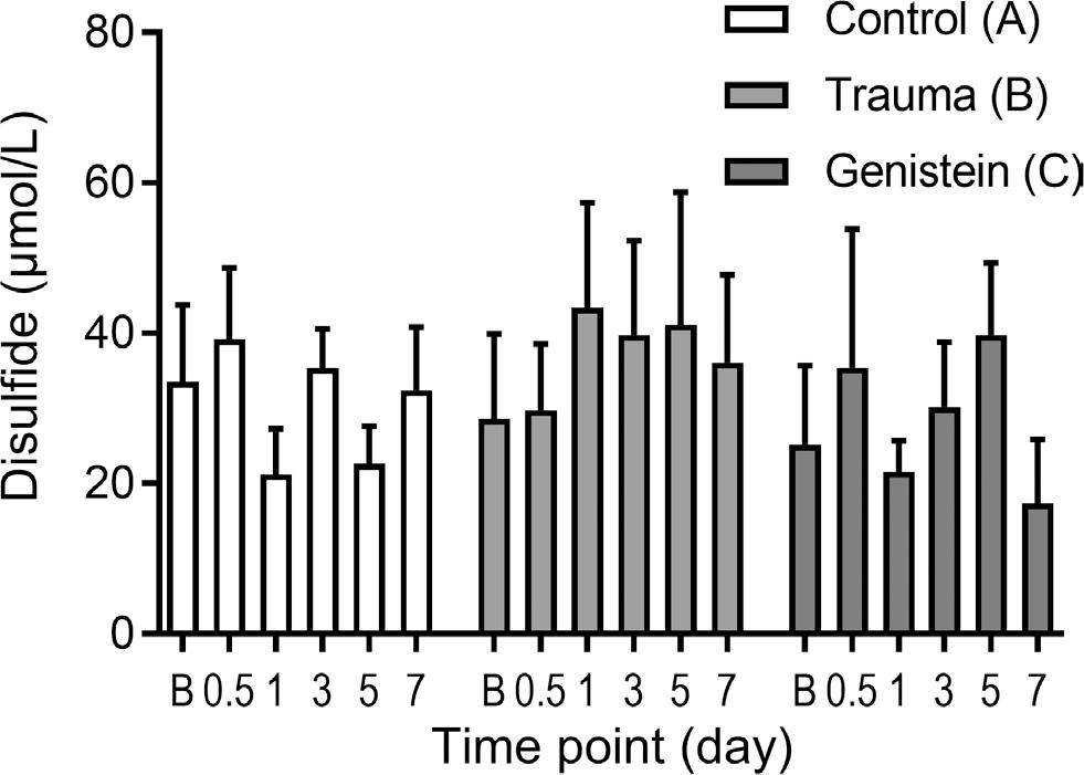SS serum levels. Significant difference was observed on the 1st, 5th, and 7th day between the control group (A white bars) and trauma group (B light gray bars) and genistein group (C dark gray bars), and between groups B and C (P = 0.004, P = 0.014, P = 0.004, respectively). Compared with the levels at baseline, on the 7th day there was no significant difference in group A; an increase in group B; and a significant decrease in group C. Bars indicate means. Error bars (SD). SS, disulfide