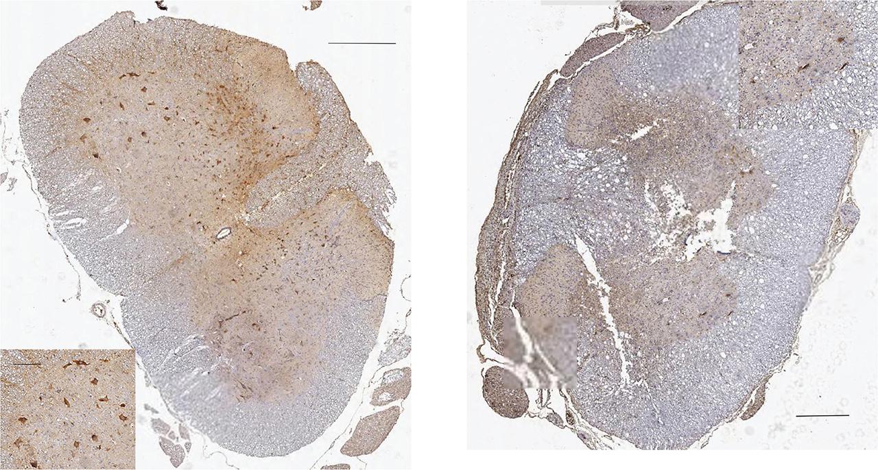 After deep general anesthesia with 1 mg/kg of ketamine and 1 mg/kg of xylazine the rats were killed on the 7th day by transcardiac perfusion with saline followed by phosphate-buffered 4% paraformaldehyde (in 0.1 mol/L phosphate-buffered saline, pH 7.4), and their spinal cords removed. No rats died unintentionally, and no infection or serious adverse events were observed during the experiment.